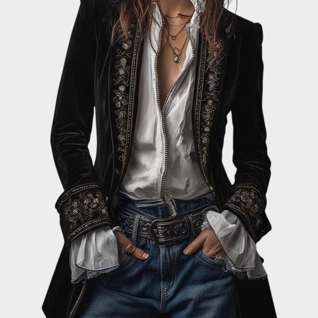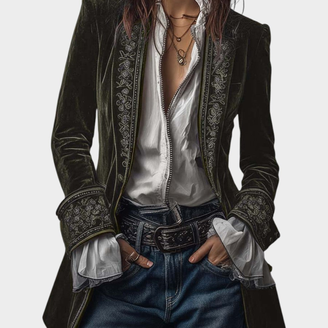La chaqueta Sara aporta una elegancia serena a tu vestuario con su tacto aterciopelado y sus delicados detalles bordados.