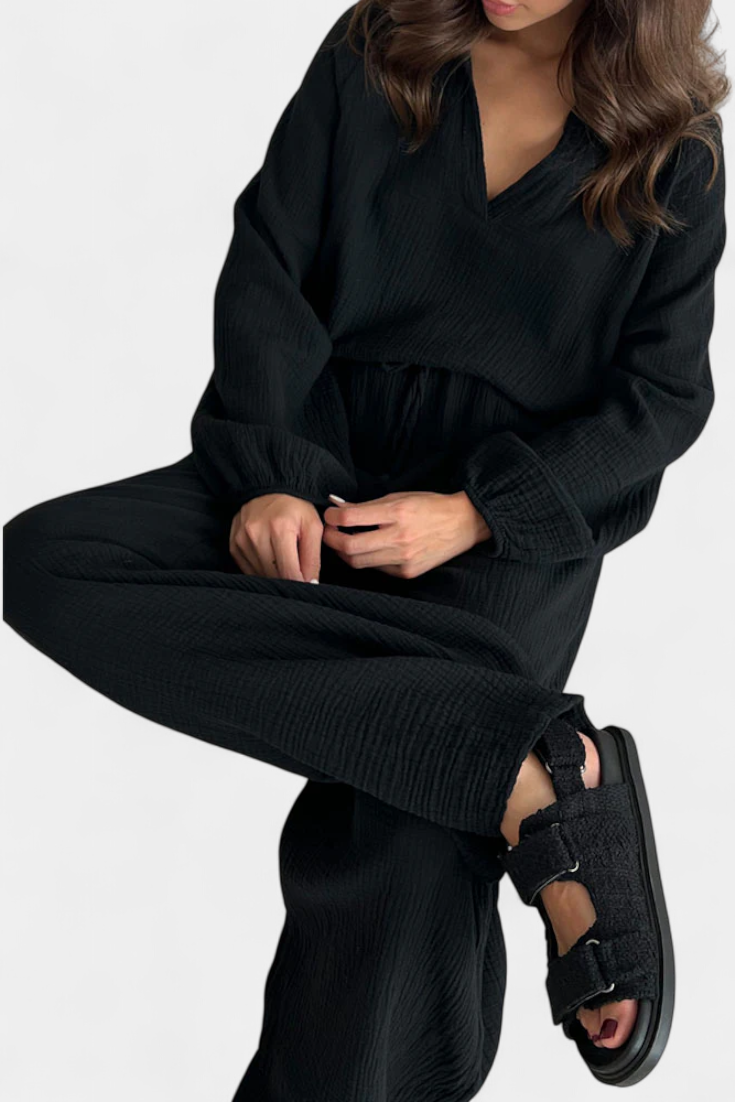 • Diseño: Escote en V, manga larga, pantalón fluido