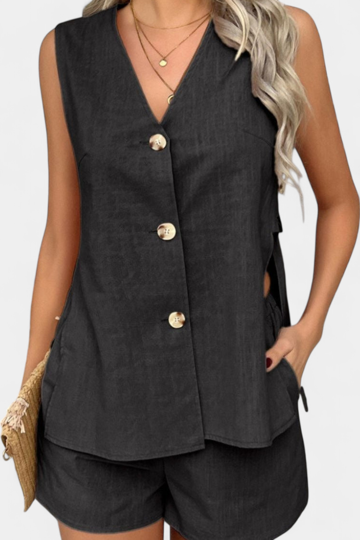 • Camisa sin mangas con escote en V y botones para un look estructurado y limpio