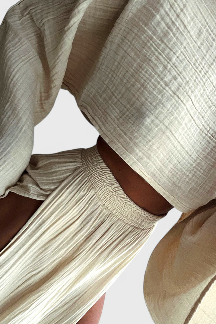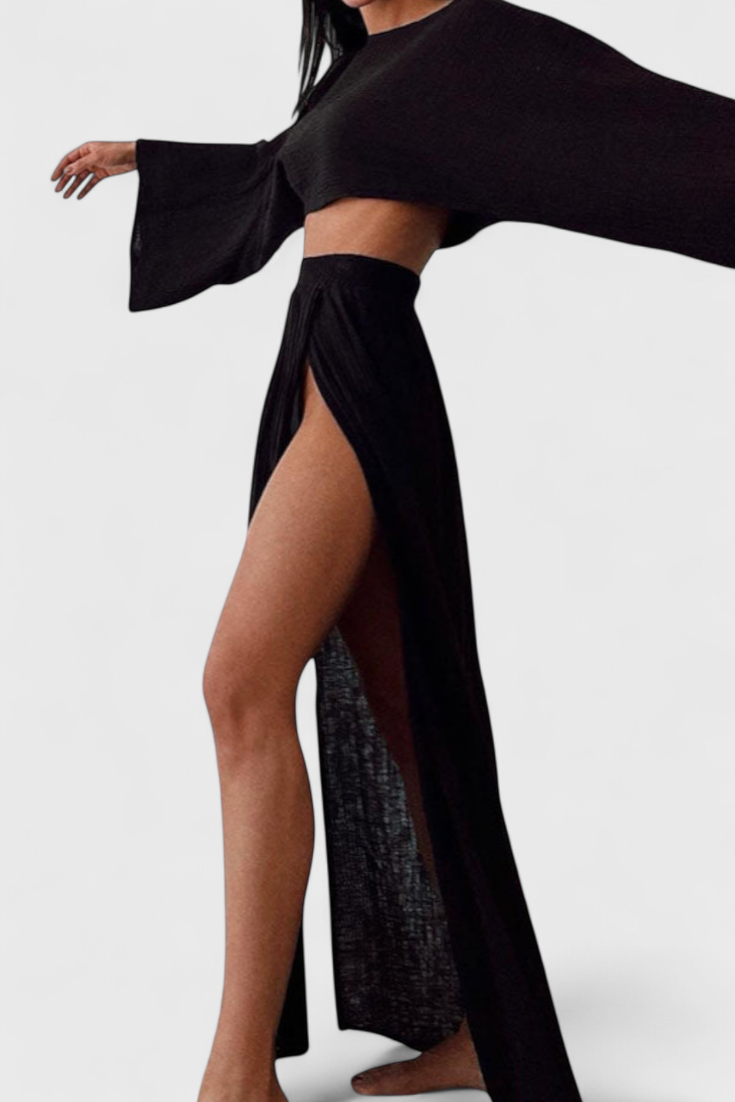 Ligero, cómodo y hecho para impresionar: el conjunto Martha fusiona un estilo moderno con una fluidez envolvente. Su top corto aireado y la falda con abertura lateral crean un equilibrio perfecto entre elegancia y frescura, ideal para días soleados o noches especiales.