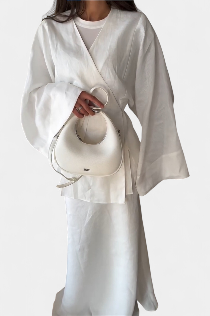 El conjunto Zelda reinterpreta los conjuntos veraniegos con elegancia relajada. Compuesto por una camisa de escote en V y una falda con abertura, esta propuesta fresca equilibra sencillez y estilo, ideal para días soleados que invitan a moverse con libertad y ligereza.