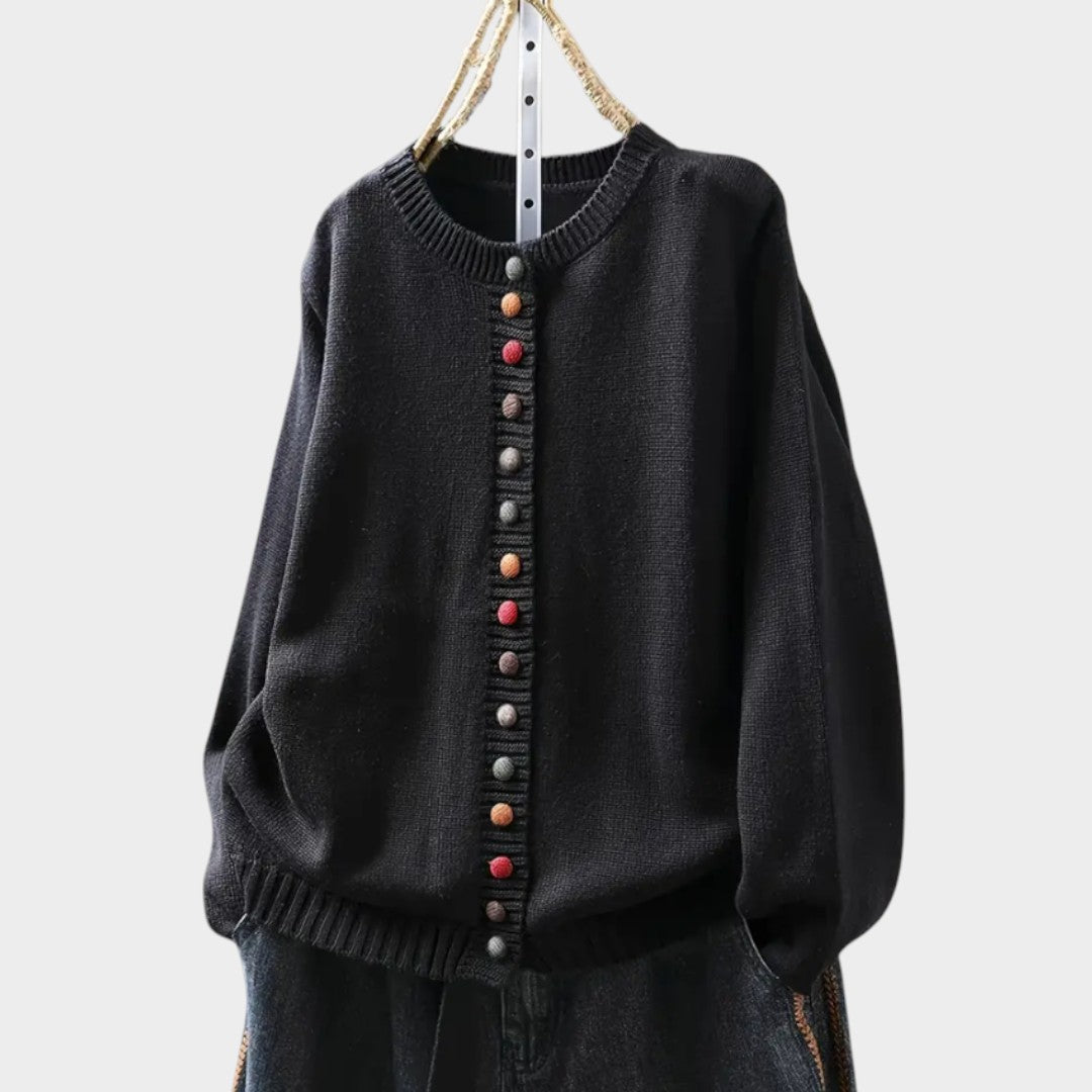 Confeccionado en tejido suave y abregado, presenta un diseño clásico con botones decorativos y cuello redondo. Ideal para looks casuales o de oficina durante otoño e invierno.