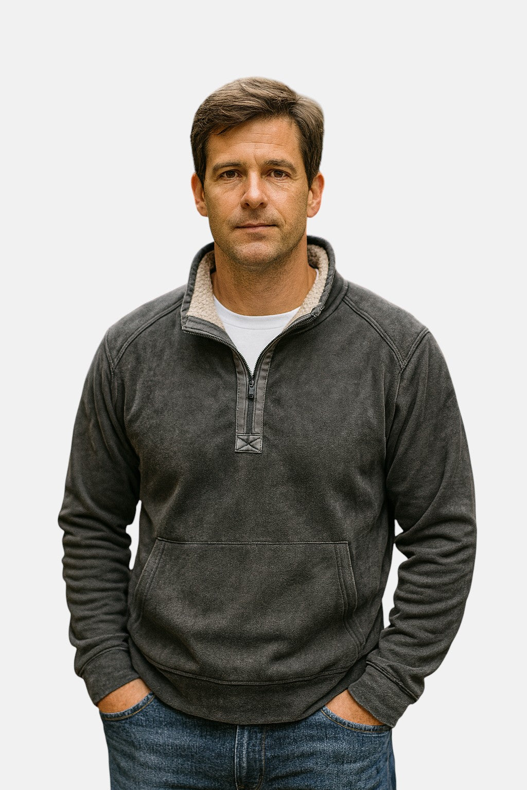 El jersey con forro polar retiene el calor en los días fríos. El diseño con cremallera de un cuarto facilita ponérselo y quitárselo, mientras que el tejido suave se adapta cómodamente sobre las camisetas. Una opción práctica para el otoño, que ofrece una calidez confiable sin agregar volumen.