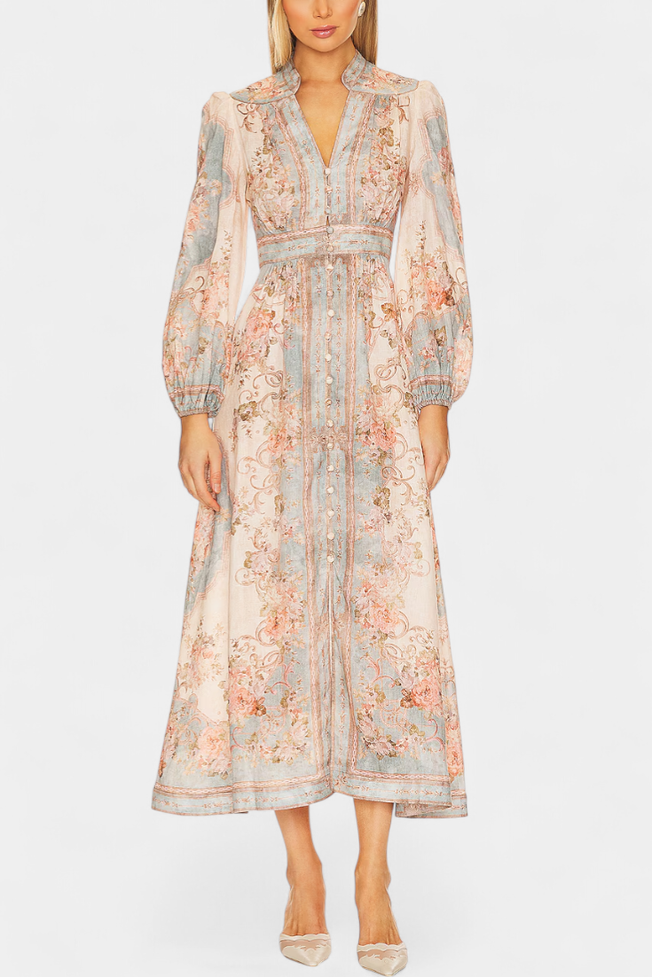 Dorotila Vestido Maxi Acampanado con Estampado Floral, Botones y Mangas Globo